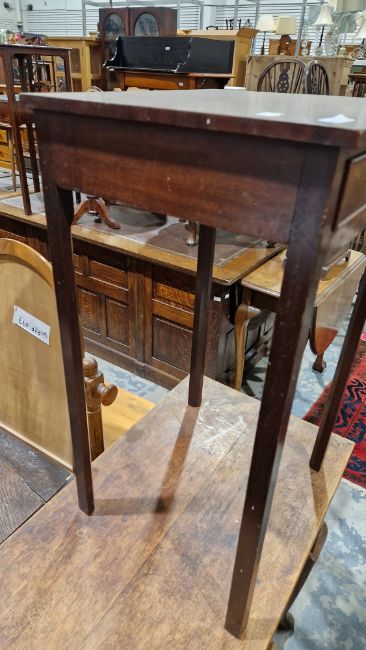 Early 19th century mahogany side table with single frieze drawer, on square chamfered legs, 71cm high x 42cm wide x 37cm deep and a small mahogany square stand, 51cm high x 33cm wide (2)  Provenance:  Hicks Beach Estate.  The majority of pieces in this collection originate from Williamstrip, Coln St Aldwyn, family seat from 1788 to 2008 and thereafter Mill House, Coln St Aldwyn.  Sir Michael Hicks Beach, Bt, succeeded his father as 9th Baronet of Beverston in 1854.  He became a Conservative Member of Parliament in 1864 and served twice as Chancellor of the Exchequer, from 1885 to 1886 and again from 1895 to 1902.  In 1906 he was raised to the peerage as Viscount St Aldwyn and in 1915 became the first Earl St Aldwyn. Condition Report Additional photos uploaded