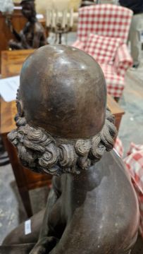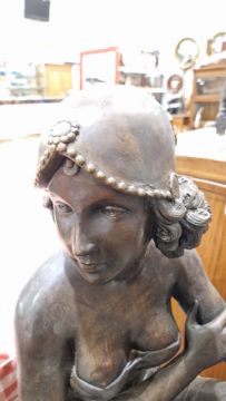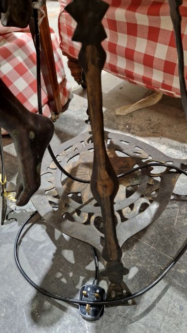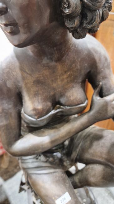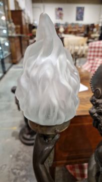 After Ferdinando De Luca, cast metal floor lamp with bronzed finish in the form of a 1920's scantily clad dancing girl sitting on a stool, with flame glass shade, 117cm high Condition Report Surface scratches, scuffs and accretions. General wear and tear.