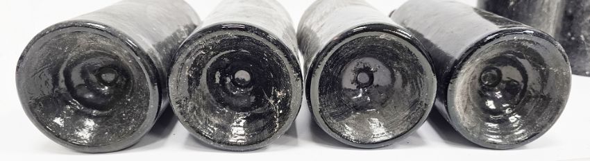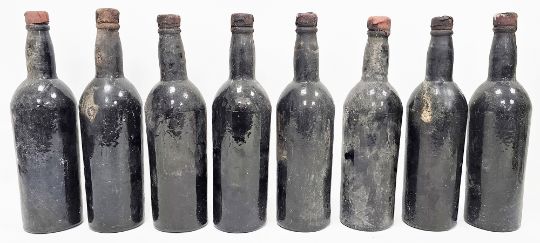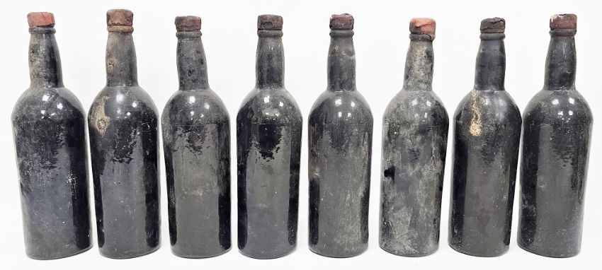 Eight bottles of unlabelled vintage port, capsules mostly intact, varying levels, one with very rough pontil mark, possibly 19th century (8)  Provenance:  Hicks Beach Estate.  The majority of pieces in this collection originate from Williamstrip, Coln St Aldwyn, family seat from 1788 to 2008 and thereafter Mill House, Coln St Aldwyn.  Sir Michael Hicks Beach, Bt, succeeded his father as 9th Baronet of Beverston in 1854.  He became a Conservative Member of Parliament in 1864 and served twice as Chancellor of the Exchequer, from 1885 to 1886 and again from 1895 to 1902.  In 1906 he was raised to the peerage as Viscount St Aldwyn and in 1915 became the first Earl St Aldwyn. Condition Report Levels - high shoulder, mid shoulder, mid neck, 3/4 bottle, mid shoulder, 3/4 bottle, low sholder, mid shoulder.