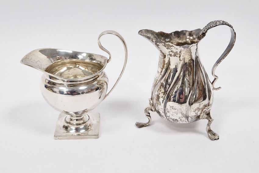 Edwardian silver cream jug, Birmingham 1903, of helmet shape on square pedestal base, 8cm high and another silver cream jug, Birmingham 1900 with fluted body on three supports, 8cm high, total weight 4ozt approx (2)
