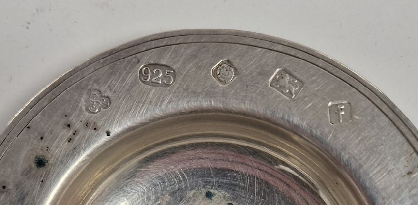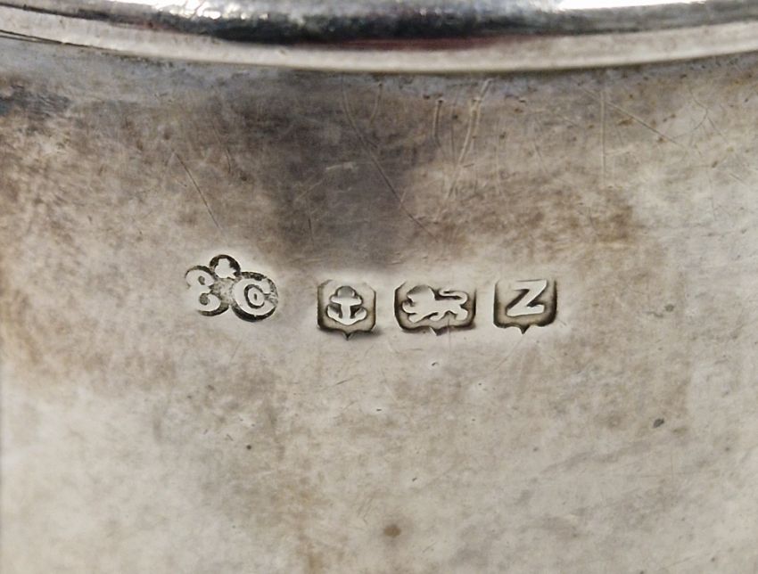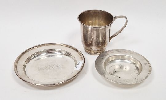 Silver mug by Elkington & Co, Birmingham 1949, of plain circular form, 7cm high and two silver pin dishes, total weight 7ozt approx (3)  Provenance:  Hicks Beach Estate.  The majority of pieces in this collection originate from Williamstrip, Coln St Aldwyn, family seat from 1788 to 2008 and thereafter Mill House, Coln St Aldwyn.  Sir Michael Hicks Beach, Bt, succeeded his father as 9th Baronet of Beverston in 1854.  He became a Conservative Member of Parliament in 1864 and served twice as Chancellor of the Exchequer, from 1885 to 1886 and again from 1895 to 1902.  In 1906 he was raised to the peerage as Viscount St Aldwyn and in 1915 became the first Earl St Aldwyn.