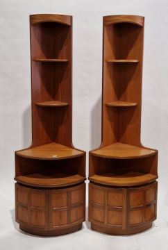 Pair of mid-century Nathan Squares teak tall corner cabinets, each comprising two shelves widening to a further shelf and two panelled cupboard doors, 193cm high x 63cm wide x 43cm deep (2)