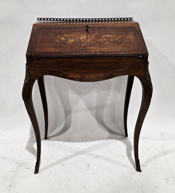 French rosewood and marquetry inlaid bureau de dame in the Louis XV manner, having pierced gilt metal back rail, floral inlaid sloping fall front opening to a fitted interior, gilt metal mounts to cabriole legs, 91cm high x 71cm wide x 43cm deep