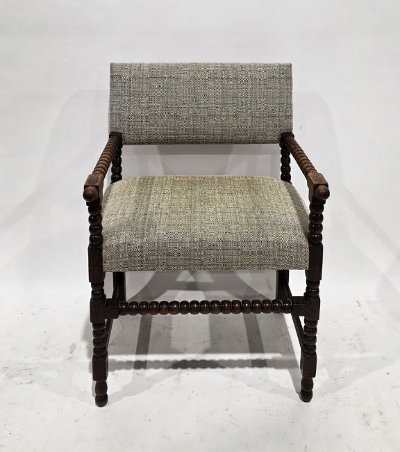 Oak bobbin elbow chair in the 17th century manner, the back and seat with contemporary grey upholstery, 79cm high x 55cm wide x 47cm deep