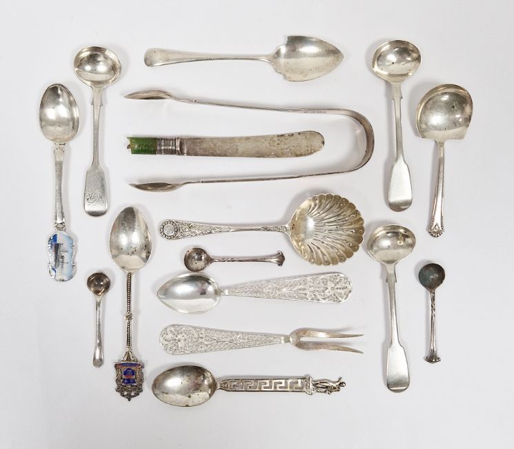 Pair of Victorian Provincial silver fiddle pattern sugar tongs by John Osment, Exeter 1842, a pair of silver fiddle pattern mustard spoons by John Osment, Exeter 1843 and another by John Stone, Exeter 1859 and other assorted silver spoons including salt spoons, enamelled souvenir spoons, sifter spoon, etc, total weighable silver 4ozt approx