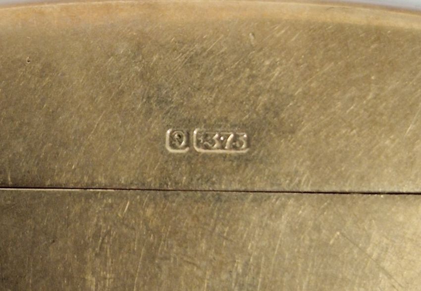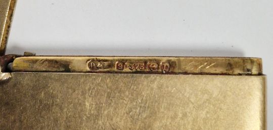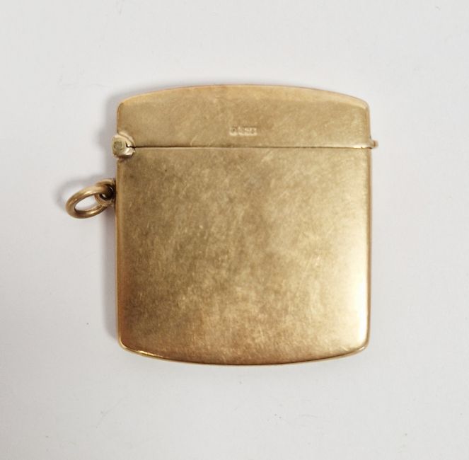 9ct gold vesta case of plain shaped rectangular form with hinged cover and suspension loop, 26.8g approx