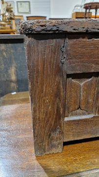 17th/18th century small coffer, the two-panel hinged lid over a three-panel front with linenfold carving, iron latch to front, on stile feet, 38cm high x 67cm wide x 38cm deep