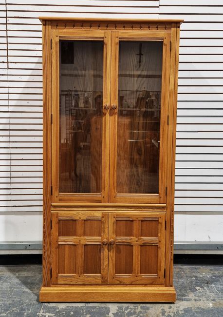 Ercol golden oak display cabinet, the upper section with two bevel glazed doors opening to three adjustable shelves over two panel doors, on plinth base, 197cm high x 96cm wide x 34cm deep