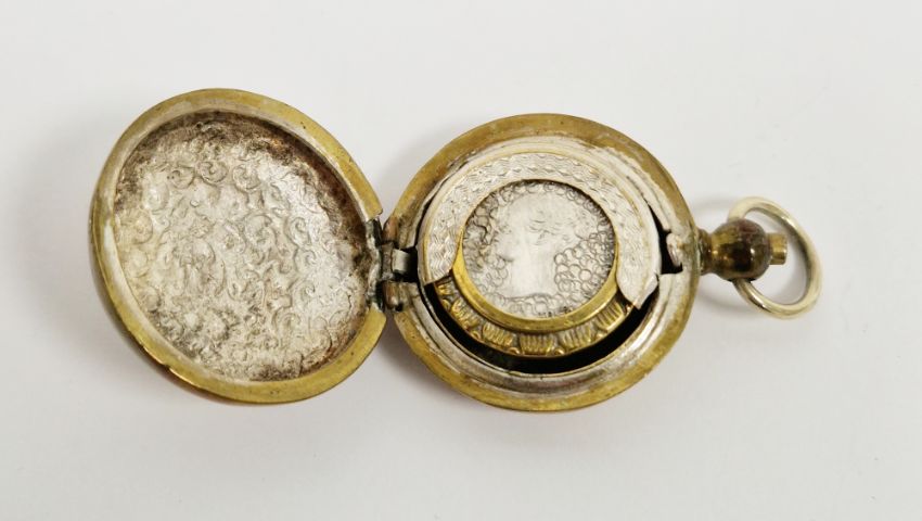 Silver, bloodstone and cornelian swivel fob, brass sovereign case and white metal magnifying glass in Maria Theresa Thaler-type case