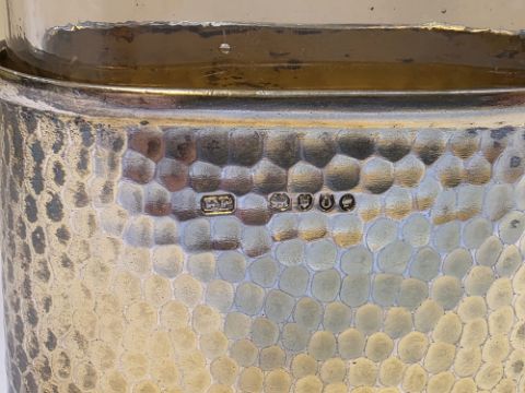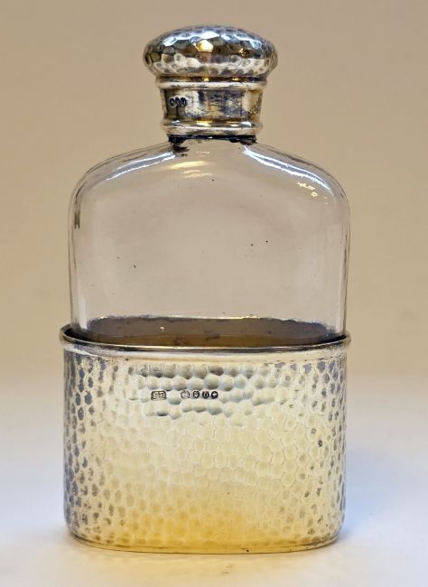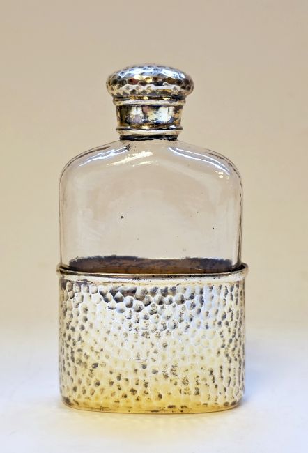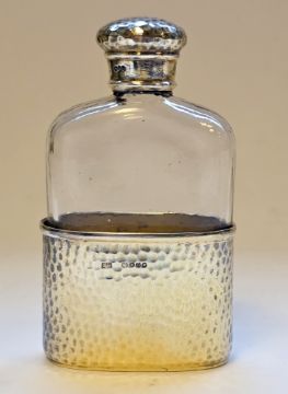 Victorian silver-gilt and glass hip flask by Frederic Purnell, London 1889, the silver-gilt cup and cover of hammered design, 13cm high  Provenance:  Hicks Beach Estate.  The majority of pieces in this collection originate from Williamstrip, Coln St Aldwyn, family seat from 1788 to 2008 and thereafter Mill House, Coln St Aldwyn.  Sir Michael Hicks Beach, Bt, succeeded his father as 9th Baronet of Beverston in 1854.  He became a Conservative Member of Parliament in 1864 and served twice as Chancellor of the Exchequer, from 1885 to 1886 and again from 1895 to 1902.  In 1906 he was raised to the peerage as Viscount St Aldwyn and in 1915 became the first Earl St Aldwyn.