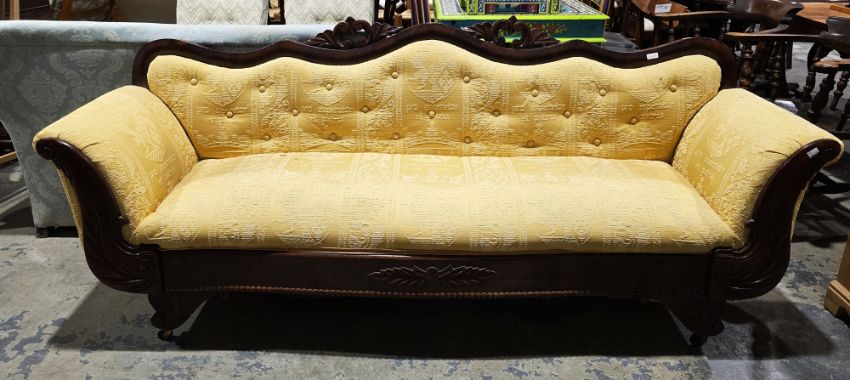 Victorian-style mahogany double-scroll end settee with wavy back and gold brocade upholstery, 88cm high x 213cm wide x 60cm deep