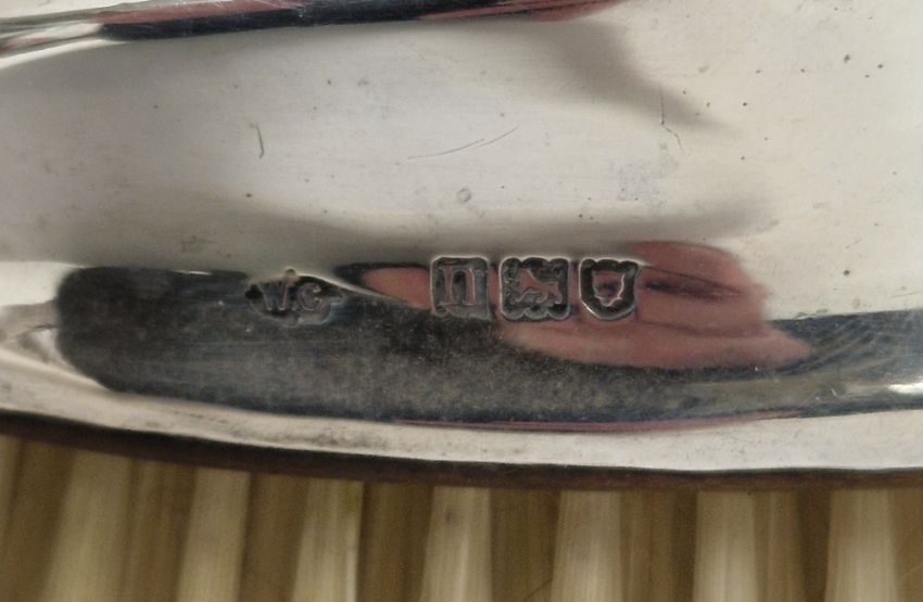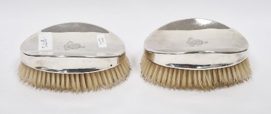 Pair of Edwardian silver-backed brushes by William Comyns & Sons, London 1908, of oval form engraved with armorials, 13cm long