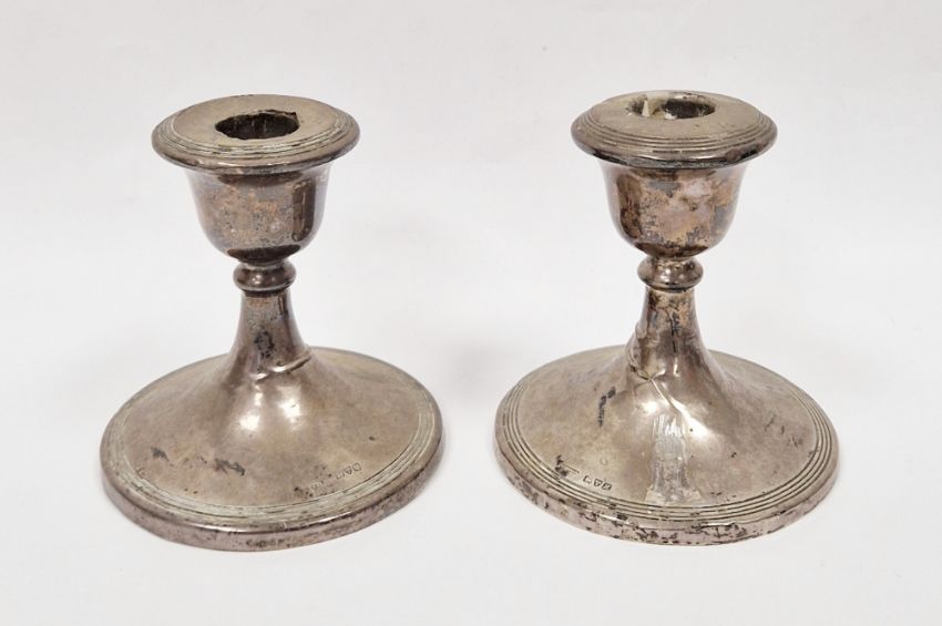 Pair of Edwardian silver dressing table candlesticks, Chester 1908 of circular form with reeded borders, 11cm high with filled bases (2)
