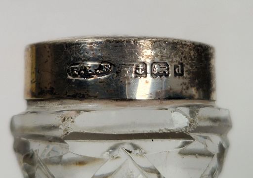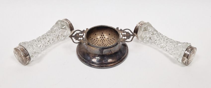 Pair silver-mounted cut glass knife rests, Birmingham 1903 and a silver tea strainer with pierced scroll handles and the flared stand, 10cm wide overall, Birmingham 1962, 64g approx