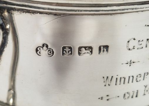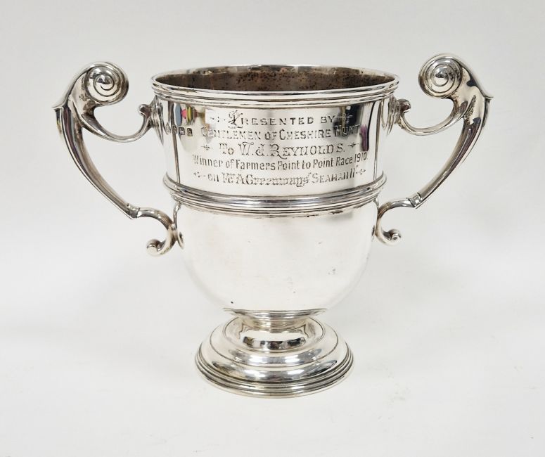 Edwardian silver two-handled trophy cup by Elkington & Co, Birmingham 1907, with moulded girdle, two scroll handles and on circular pedestal foot, with Cheshire Hunt Point-to-Point presentation inscription dated 1910, 16.5cm high, 16ozt approx