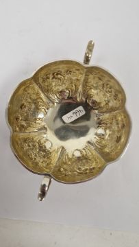 Victorian two-handled silver sugar bowl by Frederick Augustus Burridge, London 1894, of circular lobed design decorated with floral garlands and stiff leaves, scroll handles, gilt interior, 10cm diameter, a silver pin dish of circular form with pierced border, another and a silver-mounted glass desk inkwell with square glass body and silver hinged cover, total weighable silver 8ozt approx (4)  Condition Report Inkwell - Small chips to edges and corners of glass. Lid not included in total weight of silver.Pierced dish - Light surface scratches, accretions and tarnishing. Sits flat, no wobble. Diam. 12cmSugar bowl - Light surface scratches, accretions and minor tarnishing to exterior. Interior gilding slightly worn. Sits flat, no wobble. Diam. 10.5cmCircular dish - Light surface scratches, accretions and minor tarnishing. Sits flat, no wobble. Diam. 10cmGeneral wear and tear.