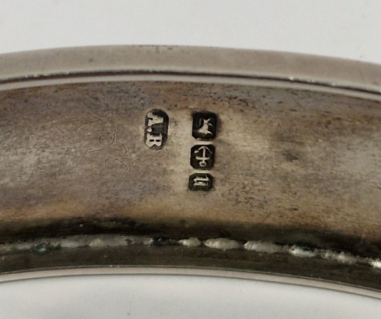 Art Nouveau silver and enamel golfing presentation spoon, Birmingham 1910, Vaughton & Sons, the stylised handle with enamel inlay depicting two golf clubs and a ball, gilt lined bowl, 14cm long, in it's original West Monmouthshire golf club 1910 case together with a Victorian silver hinged bangle, half engraved, with safety chain, approximate total silver weight 1.85ozt (2)