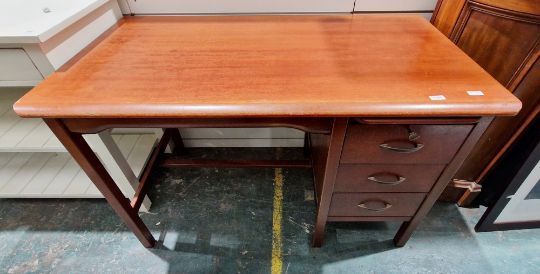 Mid-century teak office desk having a single pedestal with pull-out pen slide tray over three drawers with metal loop handles and key, on square supports, 79cm high x 122cm wide x 68cm deep