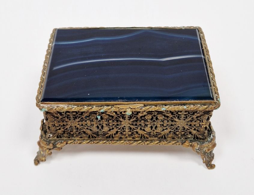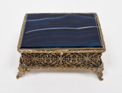 French gilt-metal filigree and banded blue agate mounted small jewel casket, late 19th century, with red velvet-lined interior, the box with dense foliate filigree work, raised on scroll feet, 11.5 cm wide  Provenance:  Hicks Beach Estate.  The majority of pieces in this collection originate from Williamstrip, Coln St Aldwyn, family seat from 1788 to 2008 and thereafter Mill House, Coln St Aldwyn.  Sir Michael Hicks Beach, Bt, succeeded his father as 9th Baronet of Beverston in 1854.  He became a Conservative Member of Parliament in 1864 and served twice as Chancellor of the Exchequer, from 1885 to 1886 and again from 1895 to 1902.  In 1906 he was raised to the peerage as Viscount St Aldwyn and in 1915 became the first Earl St Aldwyn.