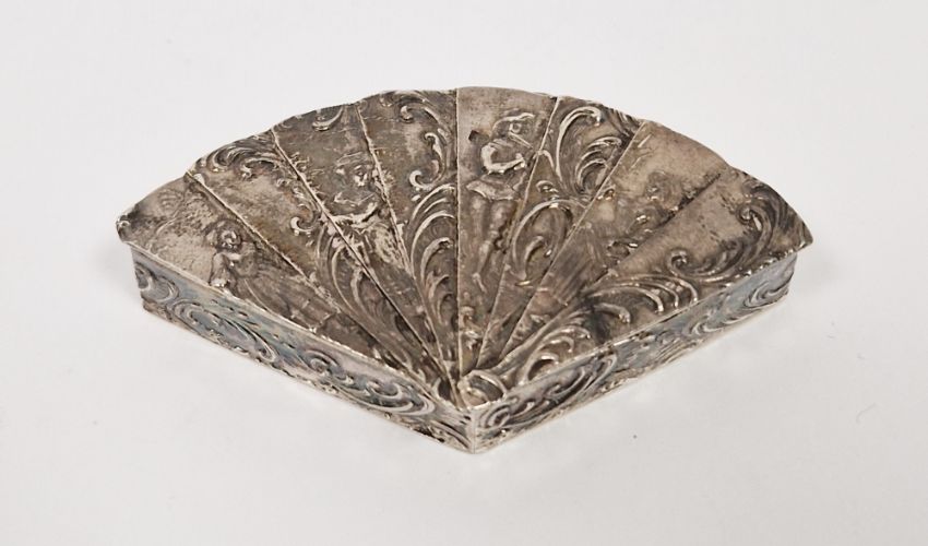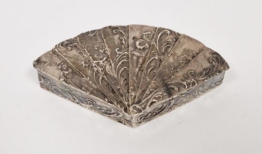 19th century novelty silver box with import marks for Sheffield 1894, modelled as a fan decorated with figures and scrolling decoration, the hinged lid revealing a gilt interior,  7cm long, 33g approx.  Provenance:  Hicks Beach Estate.  The majority of pieces in this collection originate from Williamstrip, Coln St Aldwyn, family seat from 1788 to 2008 and thereafter Mill House, Coln St Aldwyn.  Sir Michael Hicks Beach, Bt, succeeded his father as 9th Baronet of Beverston in 1854.  He became a Conservative Member of Parliament in 1864 and served twice as Chancellor of the Exchequer, from 1885 to 1886 and again from 1895 to 1902.  In 1906 he was raised to the peerage as Viscount St Aldwyn and in 1915 became the first Earl St Aldwyn.