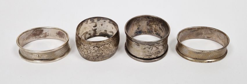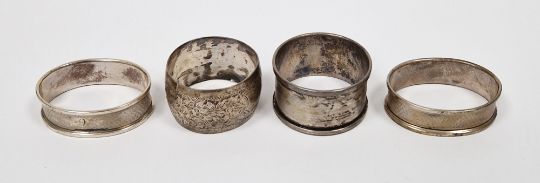 Edwardian silver napkin ring, foliate engraved, Birmingham 1906, a pair of silver napkin rings, each oval and engine-turned with initials, Birmingham 1962 and 1963 and another Birmingham 1941, 51g approx