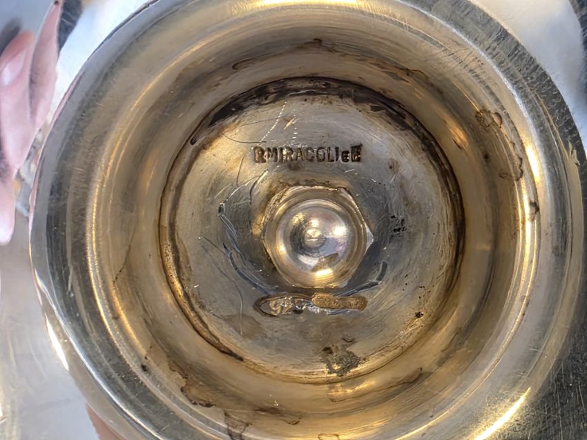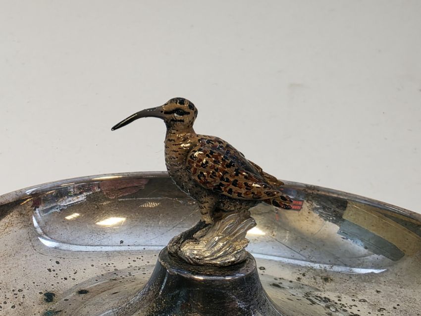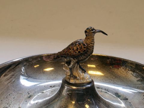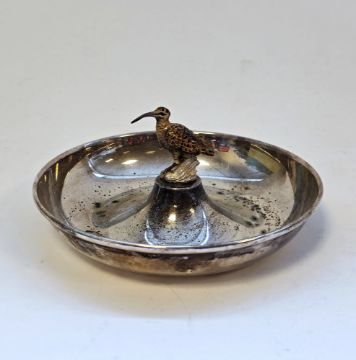 Italian 925 standard silver bowl by Romeo Miracoli of Milan, of circular form with central raised platform surmounted by an enamelled model of a snipe, 7cm high, 5ozt approx  Provenance:  Hicks Beach Estate.  The majority of pieces in this collection originate from Williamstrip, Coln St Aldwyn, family seat from 1788 to 2008 and thereafter Mill House, Coln St Aldwyn.  Sir Michael Hicks Beach, Bt, succeeded his father as 9th Baronet of Beverston in 1854.  He became a Conservative Member of Parliament in 1864 and served twice as Chancellor of the Exchequer, from 1885 to 1886 and again from 1895 to 1902.  In 1906 he was raised to the peerage as Viscount St Aldwyn and in 1915 became the first Earl St Aldwyn.