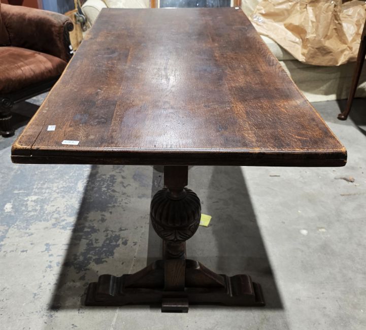 Oak refectory-style table in the 17th century manner, the rectangular top on carved cup and cover supports united by a cross-stretcher, 76cm high x 152cm long x 75cm deep