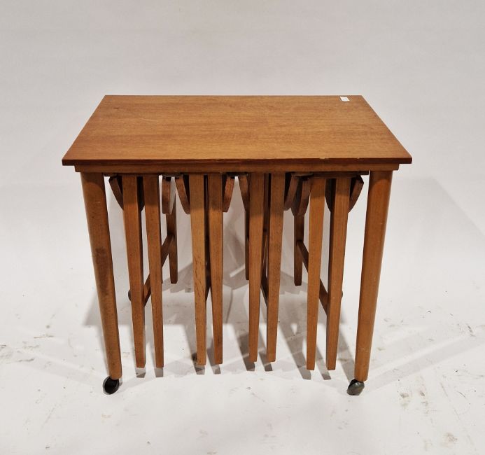 Danish Poul Hundevad mid-century nest of teak tables comprising a rectangular table on castors holding four oval fold-out tables, 56cm high x 62cm wide x 42cm deep (please note VAT will be payable on the hammer)