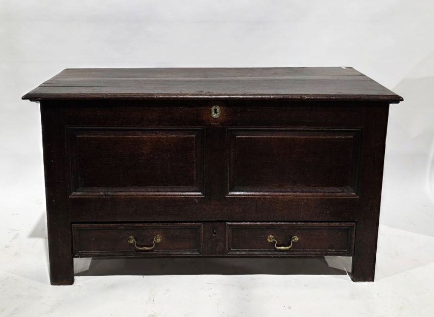 18th century oak mule chest, hinged the lid opening to a lidded candle tray, two panel front over two drawers with brass loop handles, on stile feet, 72cm high x 126cm wide x 52cm deep