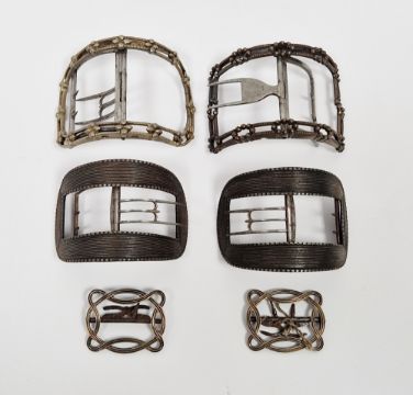 Two 18th century silver buckles, both bearing makers mark I.I, both of similar curved form decorated with faceted bead clusters and with steel mechanisms, 8cm long, a pair of Georgian steel buckles of curved oval form with banded decoration, 7cm long and a smaller pair of buckles of sinuous intertwined form, 4cm long (6)  Provenance:  Hicks Beach Estate.  The majority of pieces in this collection originate from Williamstrip, Coln St Aldwyn, family seat from 1788 to 2008 and thereafter Mill House, Coln St Aldwyn.  Sir Michael Hicks Beach, Bt, succeeded his father as 9th Baronet of Beverston in 1854.  He became a Conservative Member of Parliament in 1864 and served twice as Chancellor of the Exchequer, from 1885 to 1886 and again from 1895 to 1902.  In 1906 he was raised to the peerage as Viscount St Aldwyn and in 1915 became the first Earl St Aldwyn.