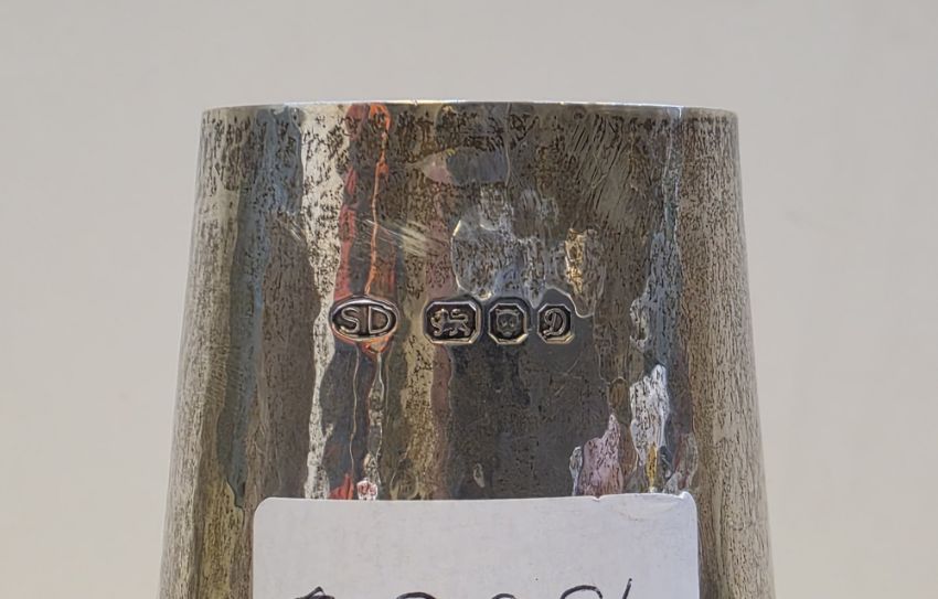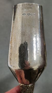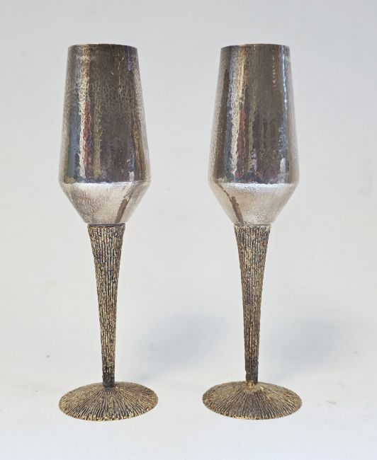 Pair of 20th century parcel-gilt silver champagne flutes by Stuart Devlin, London 1978, with hammered tapering circular bowls and gilt bark-effect stem and circular base, 23.5cm high, 17ozt (2)  Provenance:  Hicks Beach Estate.  The majority of pieces in this collection originate from Williamstrip, Coln St Aldwyn, family seat from 1788 to 2008 and thereafter Mill House, Coln St Aldwyn.  Sir Michael Hicks Beach, Bt, succeeded his father as 9th Baronet of Beverston in 1854.  He became a Conservative Member of Parliament in 1864 and served twice as Chancellor of the Exchequer, from 1885 to 1886 and again from 1895 to 1902.  In 1906 he was raised to the peerage as Viscount St Aldwyn and in 1915 became the first Earl St Aldwyn. Condition Report Good overall condition. Some very light surface marks and accretions, General wear and tear.