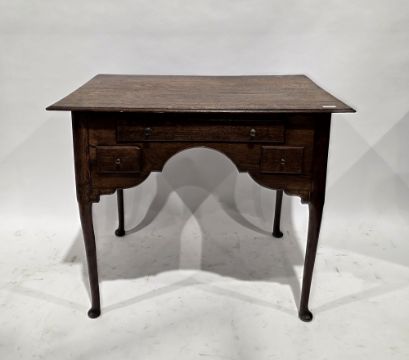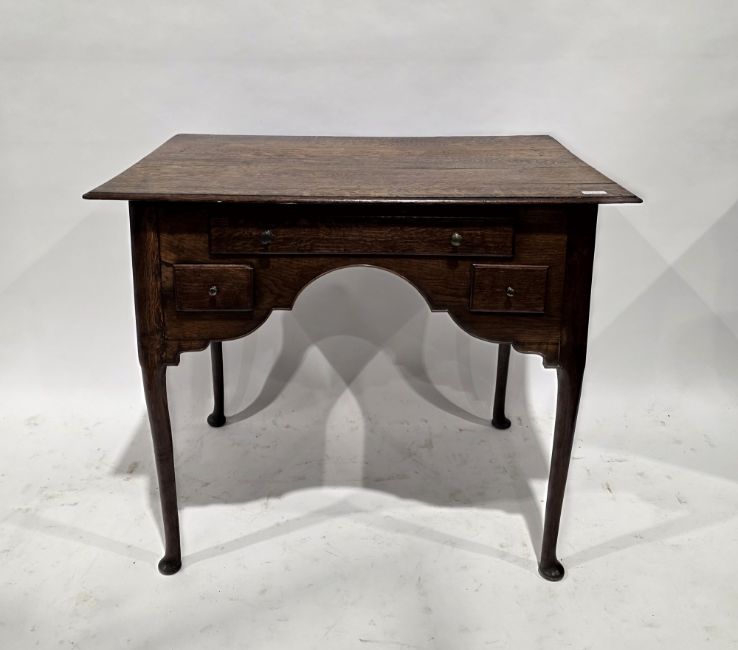 18th century oak lowboy or side table, the rectangular top with thumb moulded edge, over three drawers having metal knob handles, around a shaped kneehole, on turned tapering legs with pad feet, 72cm high x 86cm wide x 57cm deep