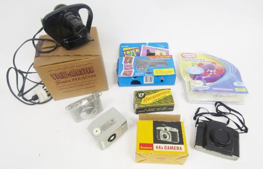 Collection of cameras and other items including boxed Trick Pics special-effects camera, Comet II camera, Kodak Brownie Vecta camera, LA Gear pocket camera, Little Tikes 35mm camera, Le-chic Le-mini camera, Promax 110 motor all-weather camera, boxed Kodak 44 A camera together with Mickey-mouse view-master, slide 35mm viewer with five packages of slides, boxed View-master junior projector, boxed KP knickerbocker 35mm slide viewer, novelty hip flask in the form of a camera and other items
