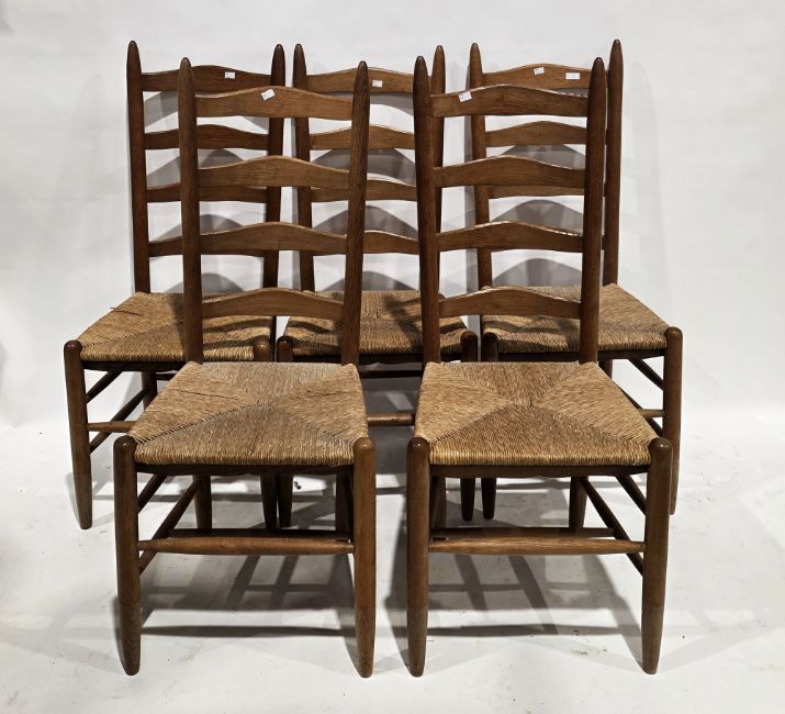 Set of five pale oak ladderback Shaker-style dining chairs with rush seats, on turned legs united by turned stretchers, 110cm high x 47cm wide x 45cm deep