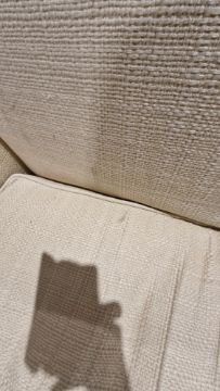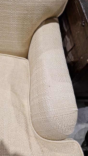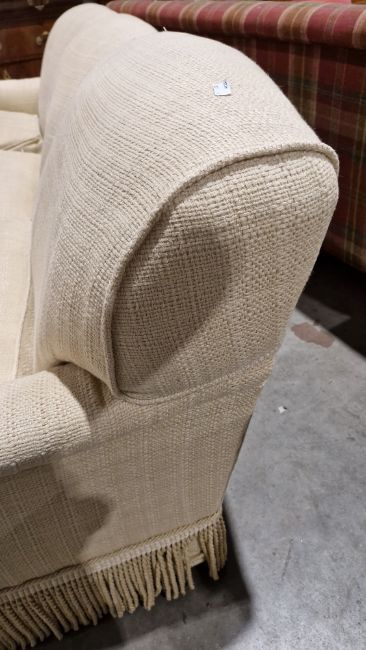 Howard-style country house large cream upholstered three-seater sofa with bullion fringe and three scatter cushions, 84cm high x 250cm wide x 113cm deep  Provenance:  Hicks Beach Estate.  The majority of pieces in this collection originate from Williamstrip, Coln St Aldwyn, family seat from 1788 to 2008 and thereafter Mill House, Coln St Aldwyn.  Sir Michael Hicks Beach, Bt, succeeded his father as 9th Baronet of Beverston in 1854.  He became a Conservative Member of Parliament in 1864 and served twice as Chancellor of the Exchequer, from 1885 to 1886 and again from 1895 to 1902.  In 1906 he was raised to the peerage as Viscount St Aldwyn and in 1915 became the first Earl St Aldwyn. Condition Report Good overall condition. Some marks and loose threads on upholstery. No labels. General wear and tear.