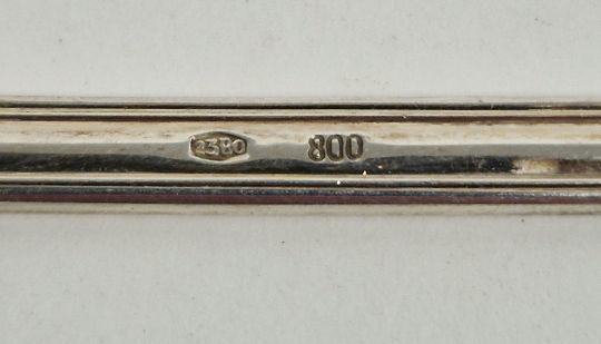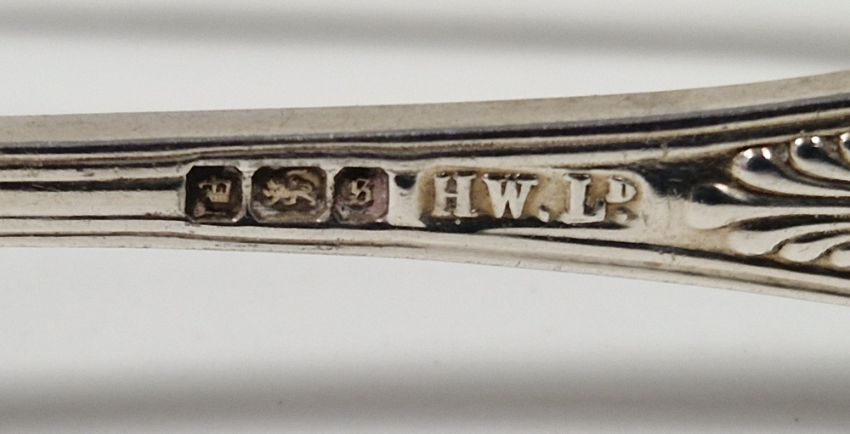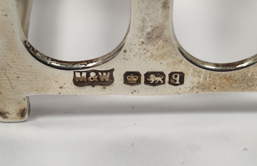 Pair of silver toast racks, Sheffield, 1933, Mappin & Webb; a modern silver oval cachou box; a pair of claw-shaped sugar-tongs, Sheffield, 1910; a sterling silver pierced berry spoon, three sterling silver mustard/salt spoons, a two-pronged 800 grade silver fork, 6.6 ozt (9)