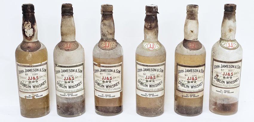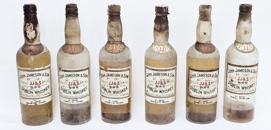 Six bottles of early/mid 20th century John Jameson and Son Limited triple star whiskey, pure old pot still, two very low, four low shoulder, bottle numbers 3587, 2997, 1503, 3716, 3588 and 3113 bottled by Innes Smith and Co Ltd, Birmingham (70o proof) (6)  Provenance:  Hicks Beach Estate.  The majority of pieces in this collection originate from Williamstrip, Coln St Aldwyn, family seat from 1788 to 2008 and thereafter Mill House, Coln St Aldwyn.  Sir Michael Hicks Beach, Bt, succeeded his father as 9th Baronet of Beverston in 1854.  He became a Conservative Member of Parliament in 1864 and served twice as Chancellor of the Exchequer, from 1885 to 1886 and again from 1895 to 1902.  In 1906 he was raised to the peerage as Viscount St Aldwyn and in 1915 became the first Earl St Aldwyn.