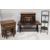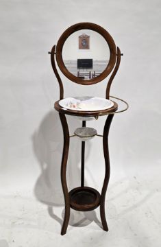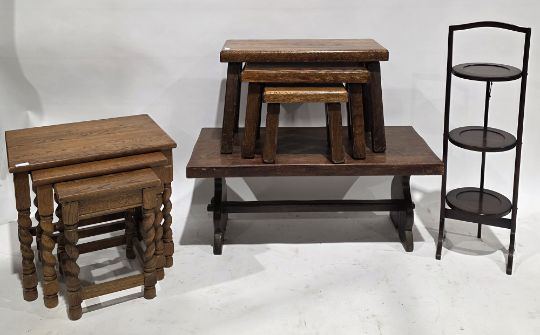 Stained wooden circular washstand in the Regency style, the circular swing mirror over a washbowl, brass towel rail and soap dish below, 133cm high x 48cm wide together with two oak nests of tables, oak refectory-style coffee table and a mahogany three tier folding cake stand, 86cm high (5)