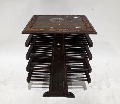 Anglo-Indian hardwood magazine table in the style of Edward Wormley, the rectangular top with carved floral border over four pairs of spindle magazine racks, 56cm high x 45cm wide x 42cm deep