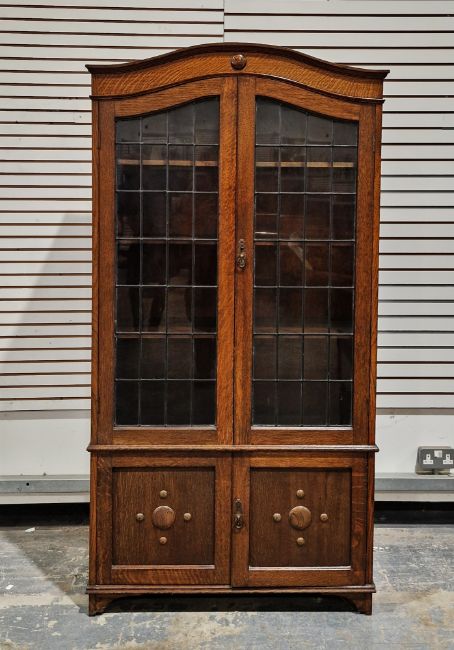 Early 20th century oak bookcase, the domed top over two leaded glazed doors opening to three adjustable shelves, panelled doors below, on small bracket feet (with key), 183cm high x 94cm wide x 34cm deep