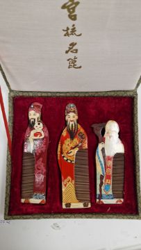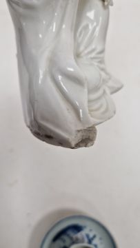 Chinese blanc-de-chine figure of Guanyin on a wooden stand, possibly Kangxi (1662-1722), seated with her arm resting on her knee, the other hand holding a scroll, 9 cm high (chipping); together with two Chinese export porcelain blue and white saucers from the Ca Mau shipwreck; three modern blue and white porcelain cups; two resin netsukes; a contemporary blue and white porcelain bowl and cover; a boxed set of modern painted wood combs