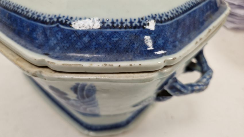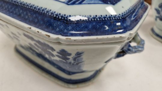 Pair of Chinese export porcelain blue and white shaped rectangular vegetable tureens and covers, late 18th/early 19th century, decorated with willow pattern within diaper and spear head borders, with artichoke finials and fruiting branch handles, 29cm wide (2) (hairline crack to one)  Provenance:  Hicks Beach Estate.  The majority of pieces in this collection originate from Williamstrip, Coln St Aldwyn, family seat from 1788 to 2008 and thereafter Mill House, Coln St Aldwyn.  Sir Michael Hicks Beach, Bt, succeeded his father as 9th Baronet of Beverston in 1854.  He became a Conservative Member of Parliament in 1864 and served twice as Chancellor of the Exchequer, from 1885 to 1886 and again from 1895 to 1902.  In 1906 he was raised to the peerage as Viscount St Aldwyn and in 1915 became the first Earl St Aldwyn. Condition Report Both tureens with surface marks, accretions. Nibbles and chips to glaze around edges and on handles. One with a star crack to base. General wear and tear.
