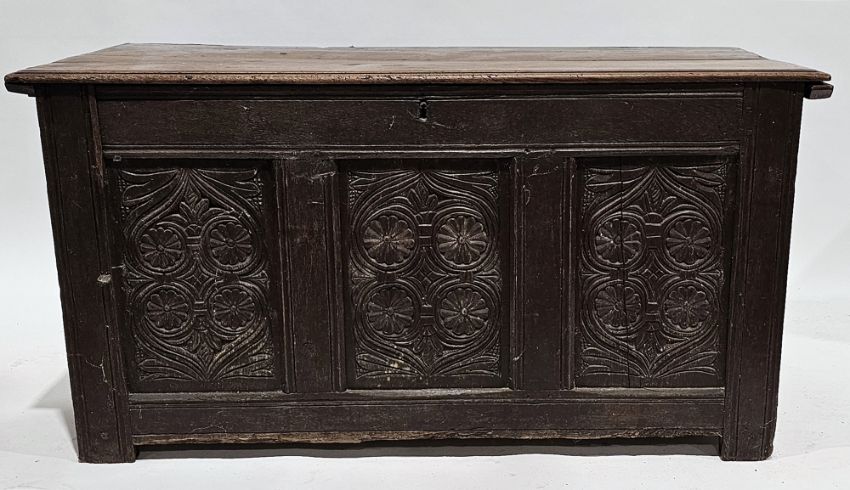 18th century oak coffer, the rectangular two-plank top with thumbmoulded edge, opening to an empty space, the three-panel front carved with rosette motifs within circular frames, on stile feet, 70cm high x 132cm wide x 61cm deep