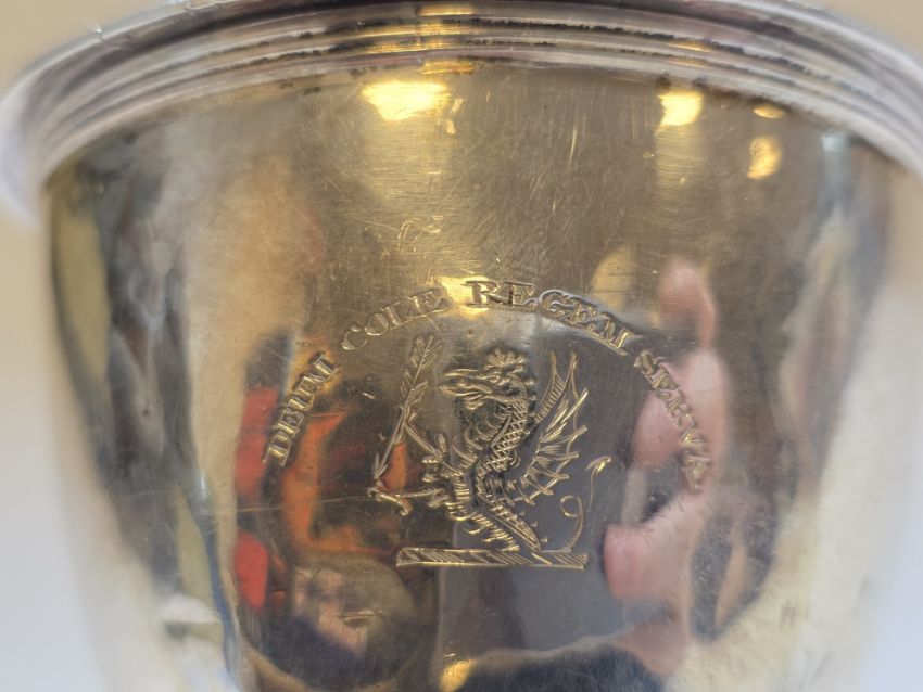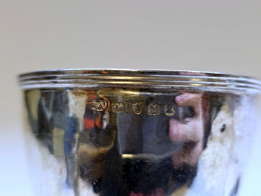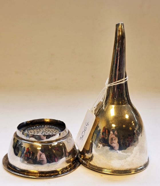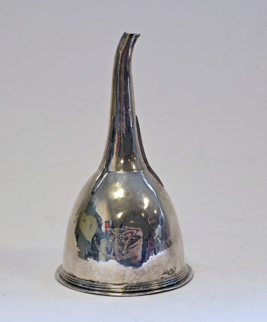 George III silver wine funnel, probably by Stephen Adams, London 1807, with reeded border engraved with motto and crest and with detachable pierced liner, 14.5cm long, 4ozt approx  Provenance:  Hicks Beach Estate.  The majority of pieces in this collection originate from Williamstrip, Coln St Aldwyn, family seat from 1788 to 2008 and thereafter Mill House, Coln St Aldwyn.  Sir Michael Hicks Beach, Bt, succeeded his father as 9th Baronet of Beverston in 1854.  He became a Conservative Member of Parliament in 1864 and served twice as Chancellor of the Exchequer, from 1885 to 1886 and again from 1895 to 1902.  In 1906 he was raised to the peerage as Viscount St Aldwyn and in 1915 became the first Earl St Aldwyn.