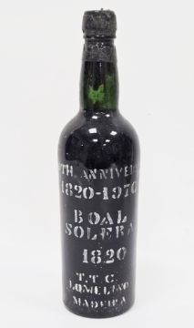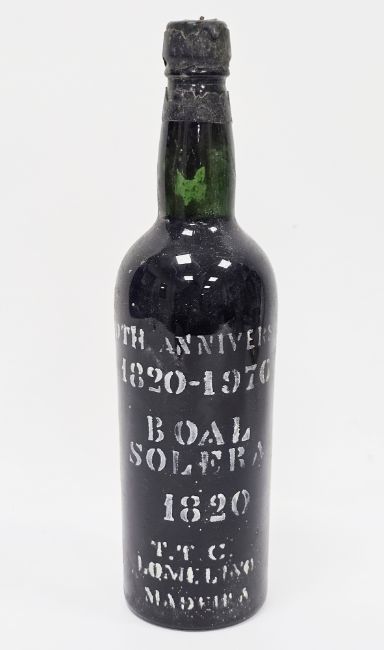 Bottle of Madeira from the 1820-1970 commemorative edition of Boal Solera, labelled 1820, reverse label is damaged so edition number not visible  Provenance:  Hicks Beach Estate.  The majority of pieces in this collection originate from Williamstrip, Coln St Aldwyn, family seat from 1788 to 2008 and thereafter Mill House, Coln St Aldwyn.  Sir Michael Hicks Beach, Bt, succeeded his father as 9th Baronet of Beverston in 1854.  He became a Conservative Member of Parliament in 1864 and served twice as Chancellor of the Exchequer, from 1885 to 1886 and again from 1895 to 1902.  In 1906 he was raised to the peerage as Viscount St Aldwyn and in 1915 became the first Earl St Aldwyn.