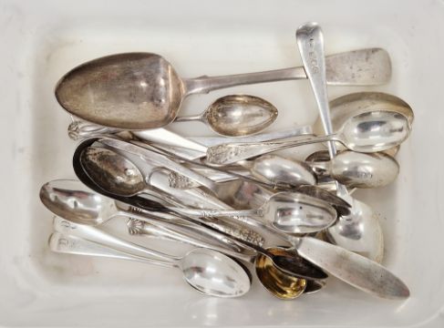 Pair of George III Irish silver fiddle pattern sugar tongs, possibly by James Brady, Dublin 1829 and a quantity of other George III and later silver teaspoons, mustard spoons, etc, total 9ozt approx