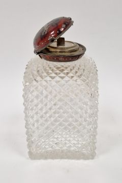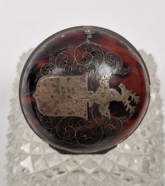 Cut glass decanter with silver and tortoiseshell cover, the hobnail cut glass body of square form, the cover converted from an 18th century tortoiseshell watch case bearing armorial and decorated with fine wirework and pique decoration, the silver-gilt collar marked for Sampson Mordan & Co, London 1880, 14cm high  Provenance:  Hicks Beach Estate.  The majority of pieces in this collection originate from Williamstrip, Coln St Aldwyn, family seat from 1788 to 2008 and thereafter Mill House, Coln St Aldwyn.  Sir Michael Hicks Beach, Bt, succeeded his father as 9th Baronet of Beverston in 1854.  He became a Conservative Member of Parliament in 1864 and served twice as Chancellor of the Exchequer, from 1885 to 1886 and again from 1895 to 1902.  In 1906 he was raised to the peerage as Viscount St Aldwyn and in 1915 became the first Earl St Aldwyn.