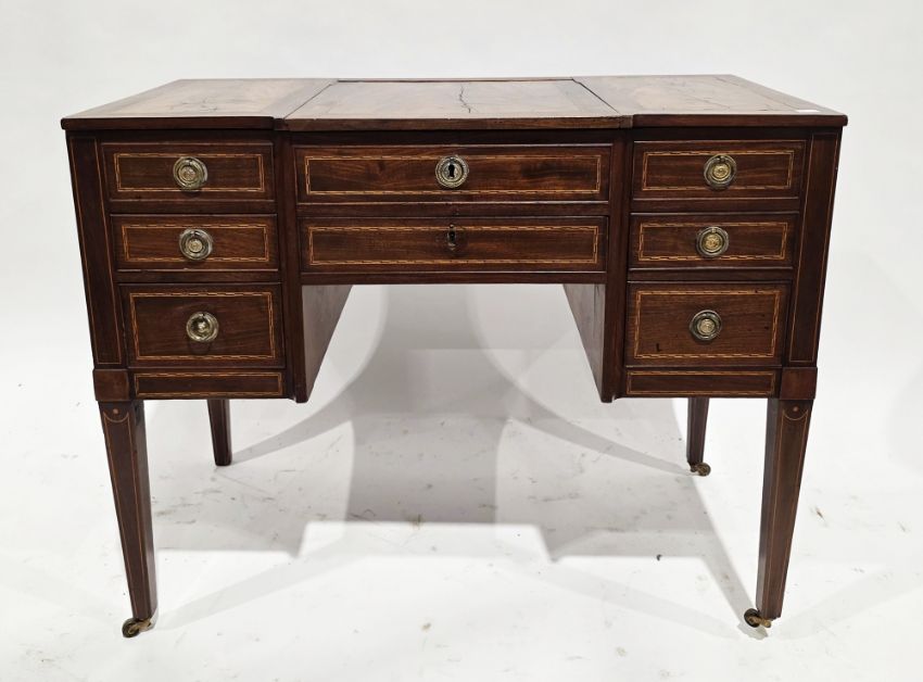 George III mahogany gentleman's dressing table of breakfront form, having ebony and boxwood string inlay, comprising a central rising mirror flanked either side by hinged sections opening to fitted interiors, over an arrangement of three faux drawers and five further drawers around a central kneehole with brass drop ring handles, on square taperings legs with castors, 76cm high x 94cm wide x 49cm deep  Provenance:  Hicks Beach Estate.  The majority of pieces in this collection originate from Williamstrip, Coln St Aldwyn, family seat from 1788 to 2008 and thereafter Mill House, Coln St Aldwyn.  Sir Michael Hicks Beach, Bt, succeeded his father as 9th Baronet of Beverston in 1854.  He became a Conservative Member of Parliament in 1864 and served twice as Chancellor of the Exchequer, from 1885 to 1886 and again from 1895 to 1902.  In 1906 he was raised to the peerage as Viscount St Aldwyn and in 1915 became the first Earl St Aldwyn.
