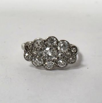 The largest central diamond with a small dark inclusion, some minor surface scratching, one small diamond with small chips around facet, some very minor misshaping to the setting at edges. Unable to comment on colour/clarity.