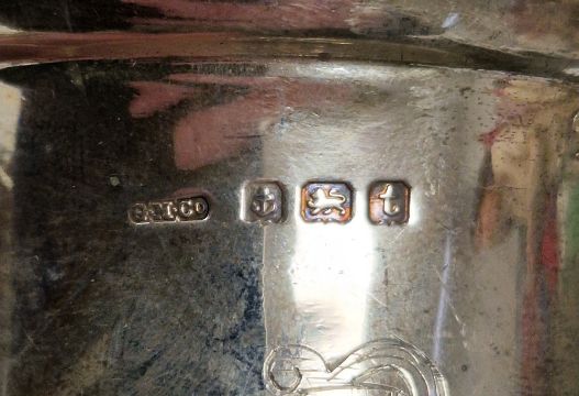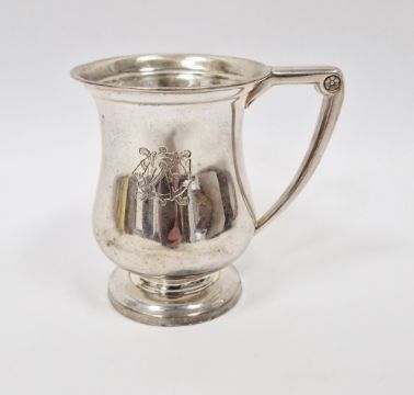 Silver mug by Goram Manufacturing Company, Birmingham 1918, of baluster form on circular pedestal foot, the angular handle with flower motif, engraved with monogram, 9cm high, 3ozt approx